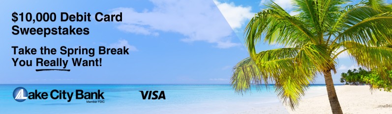 Please review Lake City Bank’s “Take the Spring Break You Really Want” $10,000 Debit Card Sweepstakes (“Sweepstakes”) Official Rules (“Official Rules”) before entering the Sweepstakes. Participation constitutes entrant’s full and unconditional agreement to these Official Rules. Lake City Bank’s decisions are final and binding in all matters related to the Sweepstakes. Winning the Sweepstakes is contingent upon fulfilling all requirements set forth herein.